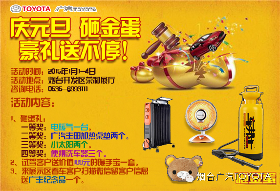 1、砸蛋礼: 一等奖:电暖气一台。 二等奖:广汽丰田加热桌垫两个。 三等奖:小太阳两个。 四等奖:便携洗车器三个。 2、试驾客户送价值188元的暖手宝一套。 3、来展示区看车客户扫描微信留客户信息送广丰纪念品一个。
