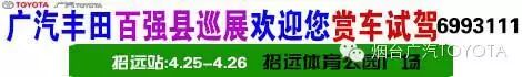 4月25日-26日 【招远站】体育公园广场 本次巡展我们还将跟车友们进行互动,到广汽丰田展区现场扫描二维码即可获得花生油一桶。 购车更有液晶电视等您来拿!资深销售顾问会向消费者详解广汽丰田品牌的优势和卖点,解答消费者的疑问,到时我们会有精美礼品赠送哦!我们将以多重精彩和惊喜等待您的惠顾!周末不见不散! 另外全新汉兰达将于4月18日火爆上市,现已全面接受预定! 预定热线:0535-6993111